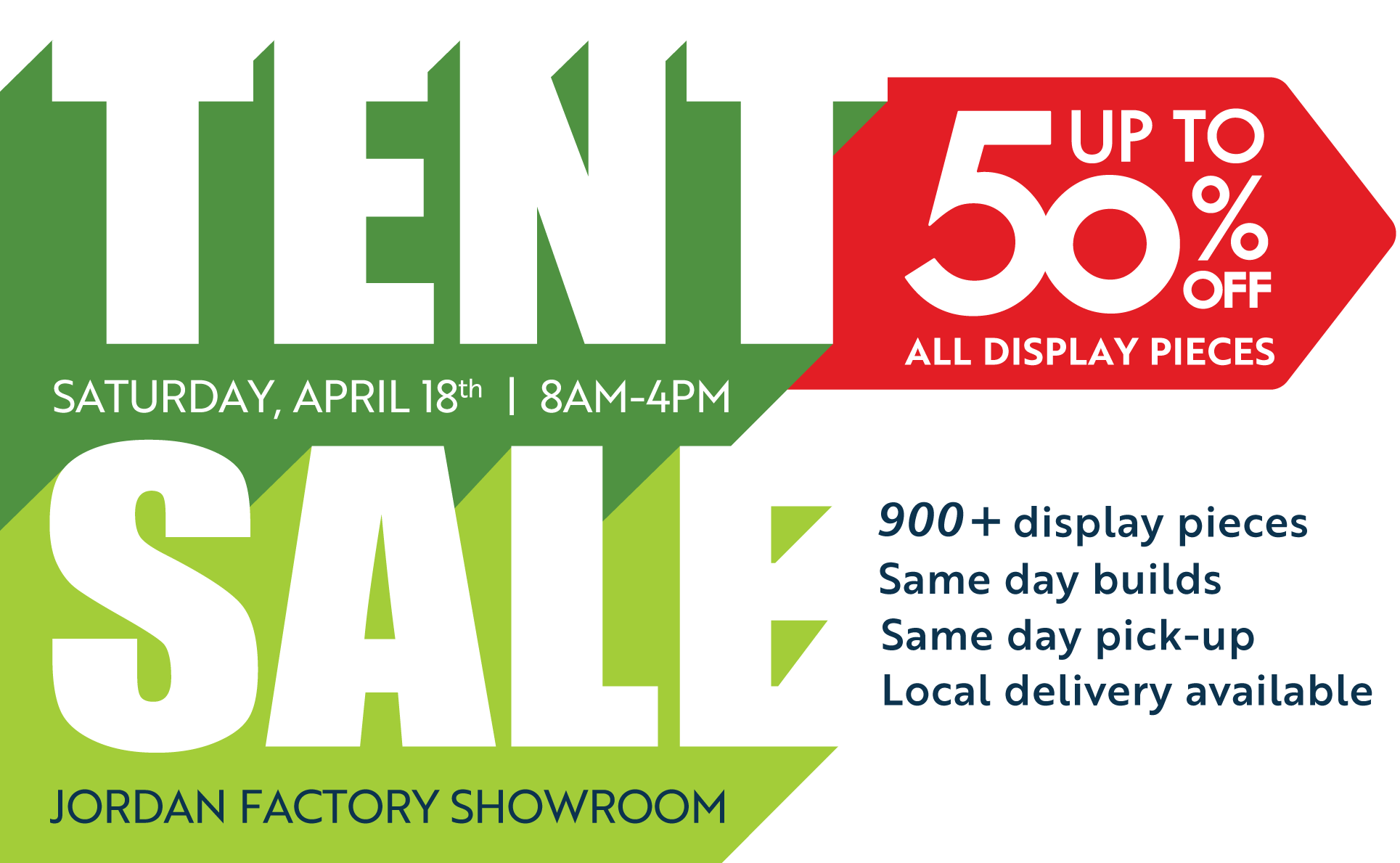 the Jordan, MN factory showroom. Save 20–50% on 900+ display pieces, all available while supplies last.